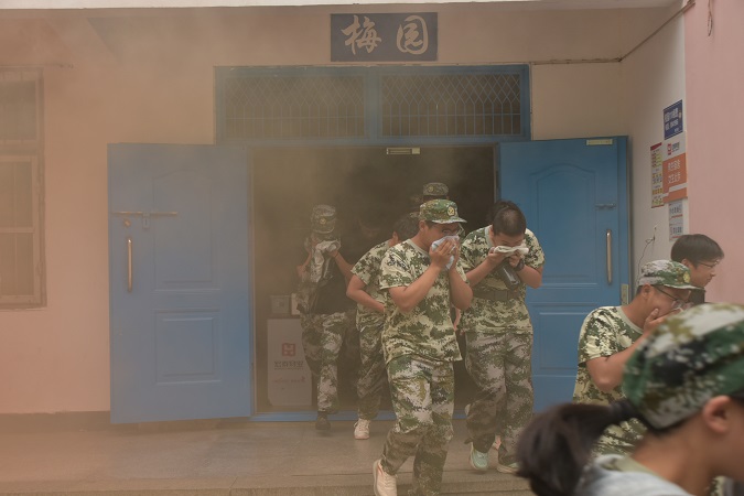 下午兩點,演練正式啟動。模擬宿舍樓某區域突發"火情",樓道內濃煙迅速蔓延。值班人員立即啟動應急響應,校園應急廣播系統同步拉響警報。全體新生在疏散指令指引下,分東西雙向撤離通道,采取彎腰、捂鼻、貼墻快速撤離姿勢,1分46秒內完成全員疏散,全程無沖撞、推搡現象。