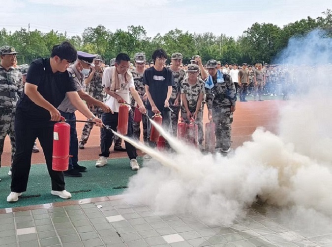 在實操演練環節,2025級新生代表與班主任共同操作滅火器材,現場進行滅火演練,切實掌握"提、拔、握、壓"的滅火器操作四步法。